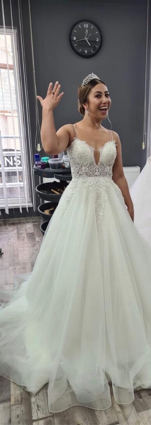 İnce askılı, straplez üst kısmı dantel detaylı, uzun A kesim beyaz gelinlik, bohem ve gösterişli tarzda.