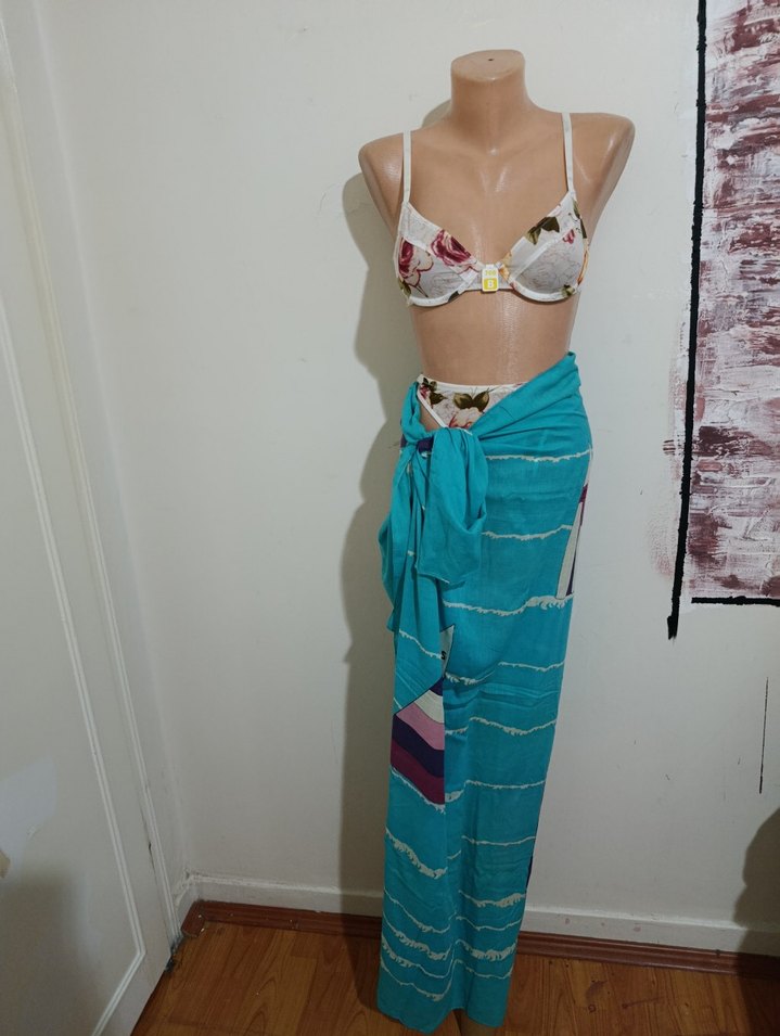 İnce askılı, batik desenli turkuaz uzun pareo, bol kesim ve drapeli tarzda, plaj için uygundur.