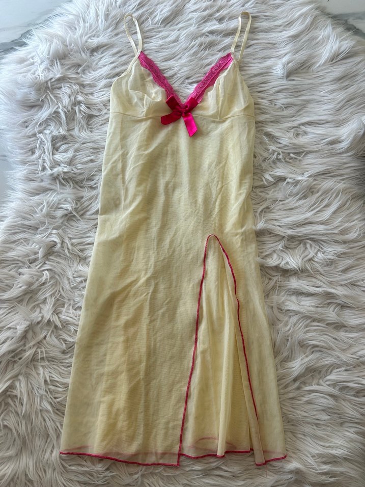 İnce askılı, V yakalı, pembe dantel detaylı ve uzun boylu beyaz tonlarında gecelik. Ön kısmında yırtmaç bulunur. Likralı L/XL bedene uyar bir askısında küçük bir boya izi var