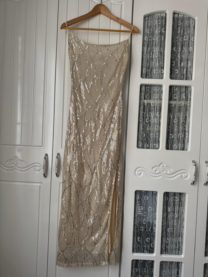 İnce Askılı Uzun Parlak Bej Abiye Elbise Yırtmaçlı