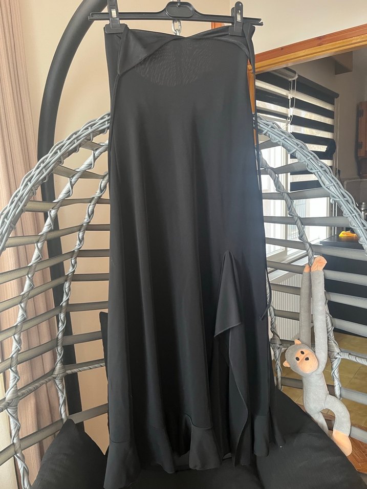 Dökümlü tasarıma sahip, yumuşak kumaştan uzun siyah etek. Gevşek kesimiyle gotik tarzda günlük kullanım için uygundur.