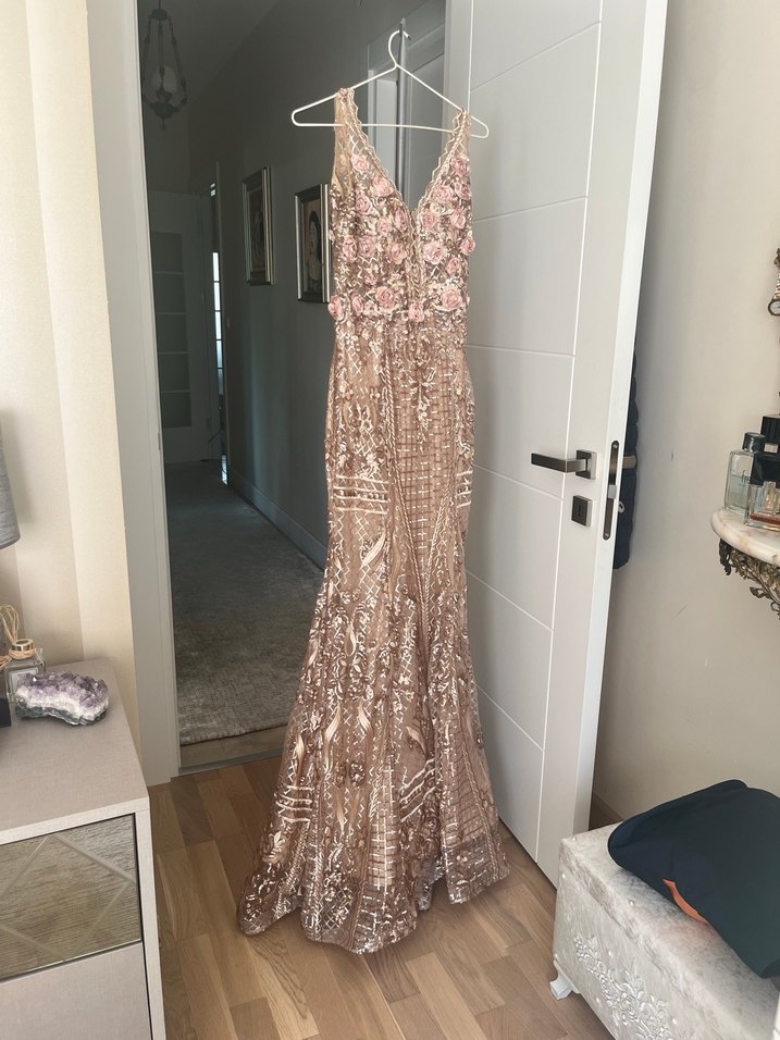 İnce askılı, V yakalı ve işlemeli dantelli uzun bej abiye elbise. Parlak detayları ve bohem tarzıyla dikkat çeker. Trendsetter ve avangart stil için ideal.