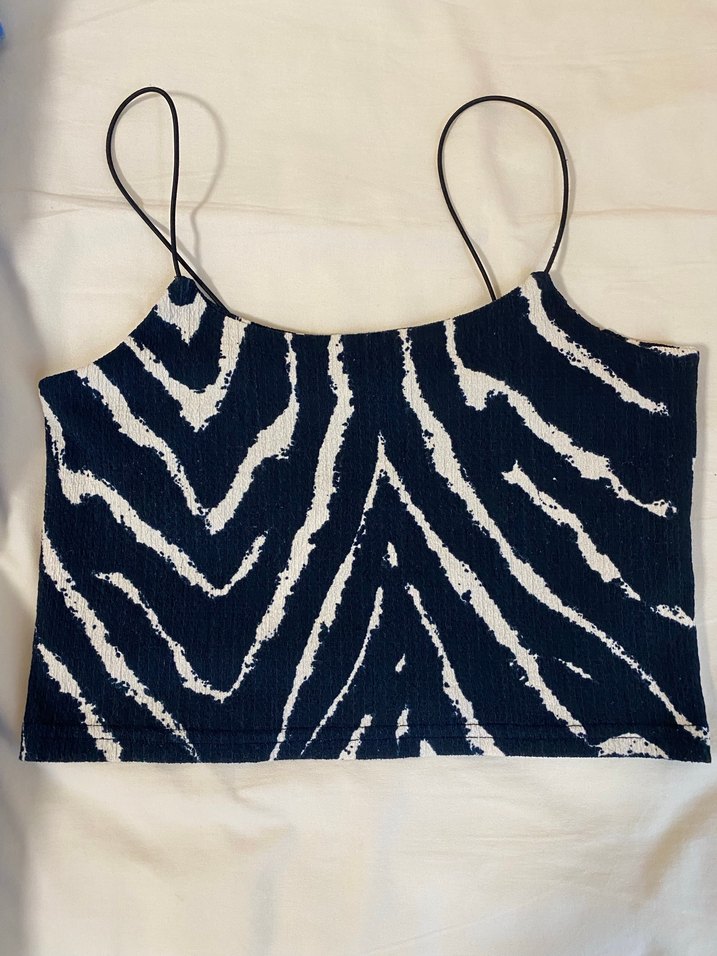 Lacivert renkli, zebra desenli, ince askılı ve tekne yakalı, pileli mini ve vücuda oturan crop top.