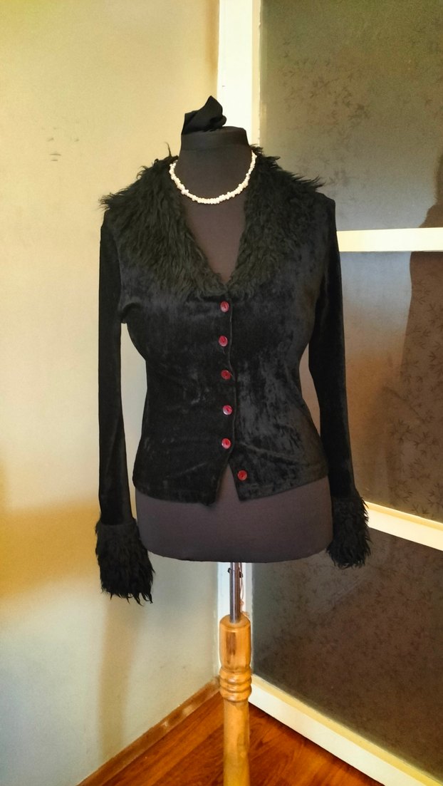 ince siyah fitilli kadife yakası ve kolları kürk tarzında esneyen bir kumaş ceket cok şık duruyor üzerinde