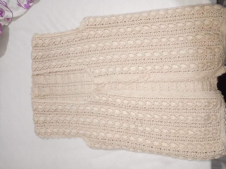 İnce işlemeli, dantel detaylı bej triko kazak, uzun boy ve kayık yaka ile şık bir görünüm sunar.