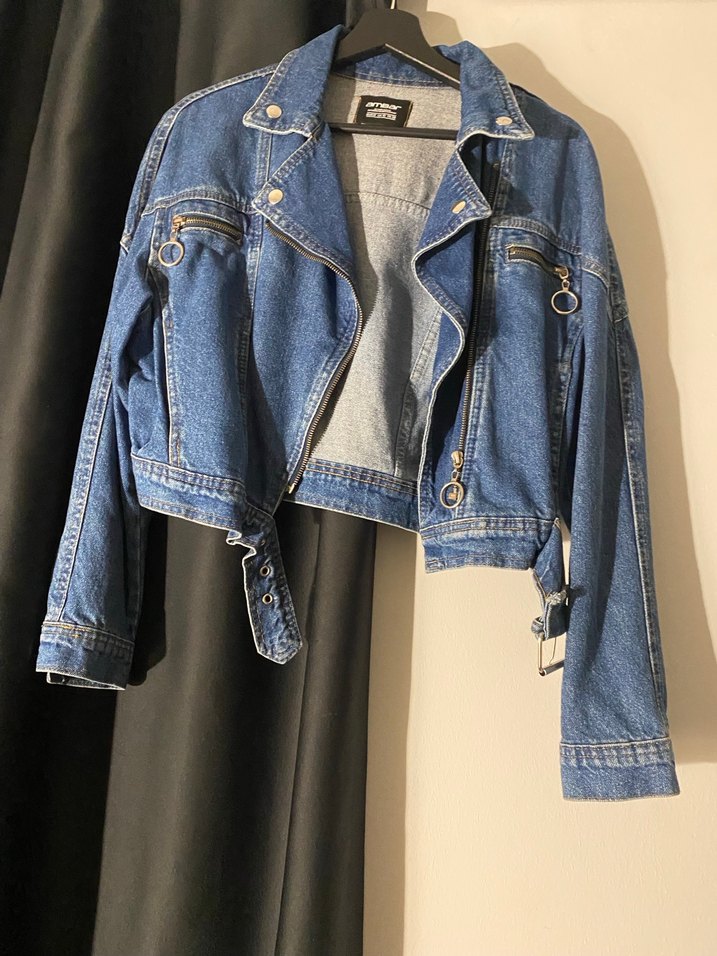 ambar markalı Bol kesim, mavi denim ceket. Kemer ve fermuarlı cepler detayları. Rahat günlük stil için uygun.