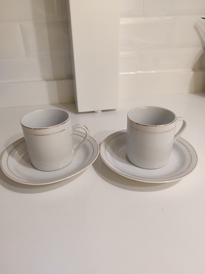 İnce gri kenarlıklı beyaz seramik fincanlar ve tabaklar, içecek sunumu için uygundur. ☕