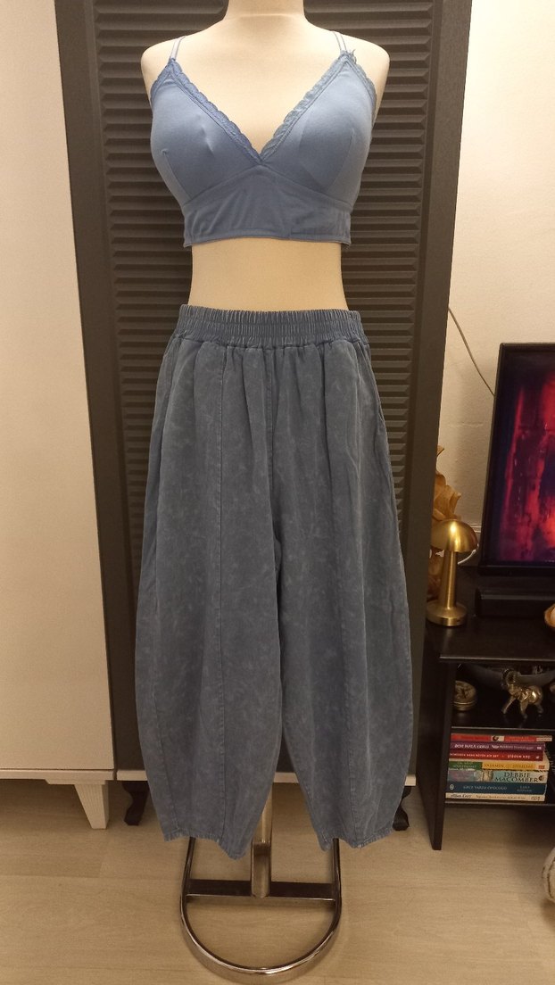 İNCE KOT GRİ MAVİ MİDİ LOOSE FİT KADIN PANTOLON