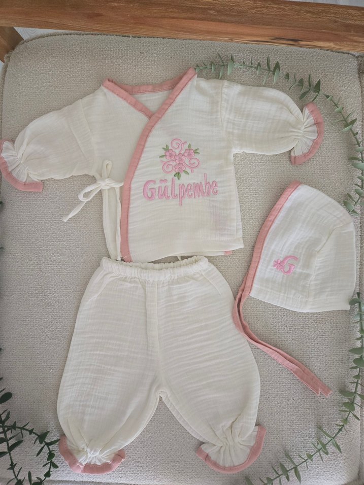 İnce müslin isim Nakışlı Biyeli hastane çıkış seti