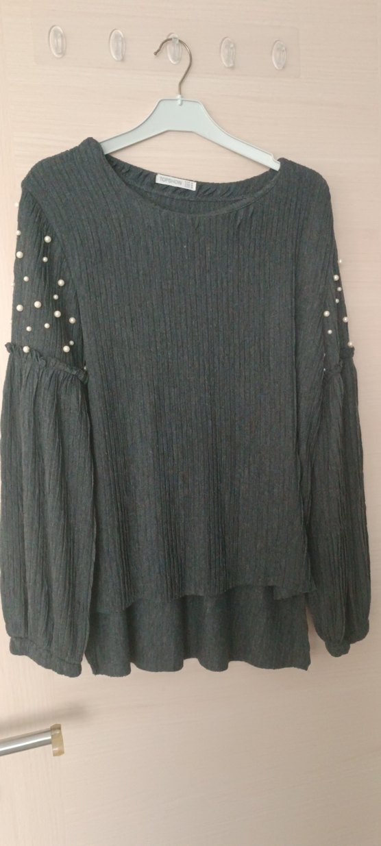 Uzun kesim, bol fit gri örgü triko, yuvarlak yaka ve uzun kollarda işlemeli inci detaylarıyla. Günlük kullanıma uygun rahat ve konforlu.