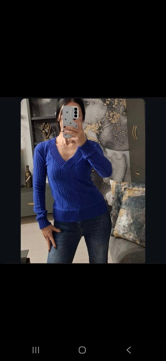 Derin v yaka,örme,triko kumaş,ince ama dış kısmı tüylümsü gibi yapıdadır.Yakından da çekim yaptım.Herhangi bir sorunu yok.Kullanılmışlığı anlaşılıyor sadece,tertemiz üründür.Beden etiketi yok.Ama s beden uyumludur.Bende s bedenim fotodaki gibi duruyor.