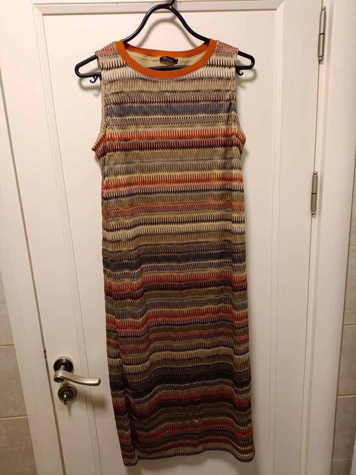 Kolsuz, ince örgü kumaştan yapılmış, diz altina gelen (omuzdan etek ucuna 116 cm) her yere giyilebilcek şık ve ayni zamanda rahat bir elbise, sol yaninda kucuk yirtmaci var ve icinde elbiseden daha kisa olan astari var hepsi fotoğraflarda. Large beden yaziyor ama medium large arasi diyebiliriz, hatta medium beden daha rahat giyebilir.