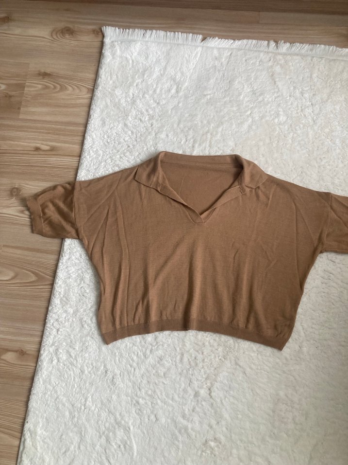 Bej renkli, V yakalı ve bol kesim kadın kazak. Yumuşak yün kumaştan, uzun kollu ve normal boyda, günlük kullanım için uygun.
