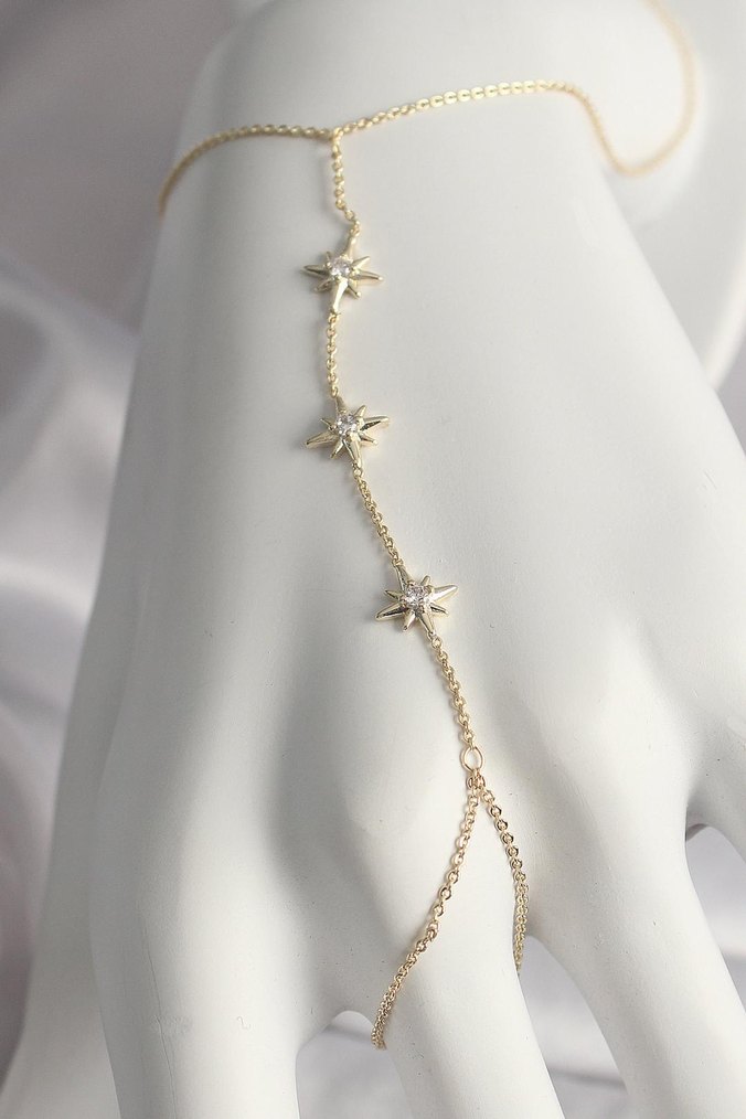 Altın renkli el zinciri, ince zincir detayları ve işlemeli yıldız desenleriyle dikkat çeker. Günlük kullanıma uygun cesur bohem tarzını yansıtır. ✨