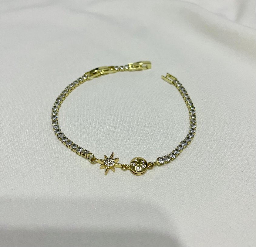 ✨Tüm ürünlerimiz kararma, solma ve paslanmaya karşı garantilidir Altın renkli, ince zincir detaylı bileklik, işlenmiş yıldız ve yuvarlak figürlerle minimalist ve klasik şıklığı günlük kullanım için sunar. ✨
