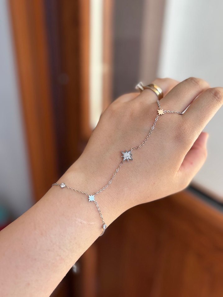 Altın renkli, ince zincir detaylı ve nakışlı yıldız desenli bohem tarzı kadın el zinciri. ✨
