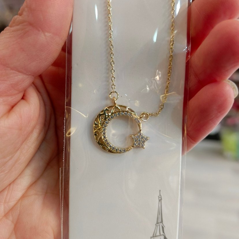 Altın renginde ince zincirli, nakış detaylı ay ve yıldız figürlü kolye, sade ve bohem tarzda günlük kullanıma uygundur. ✨
