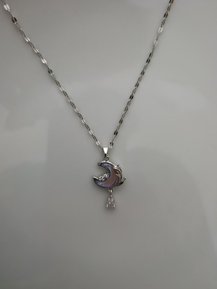 İnce zincirli, ay şeklinde beyaz kolye ucu ve damla detaylı sade bohem tarzda midi uzunlukta günlük kullanıma uygun kolye.