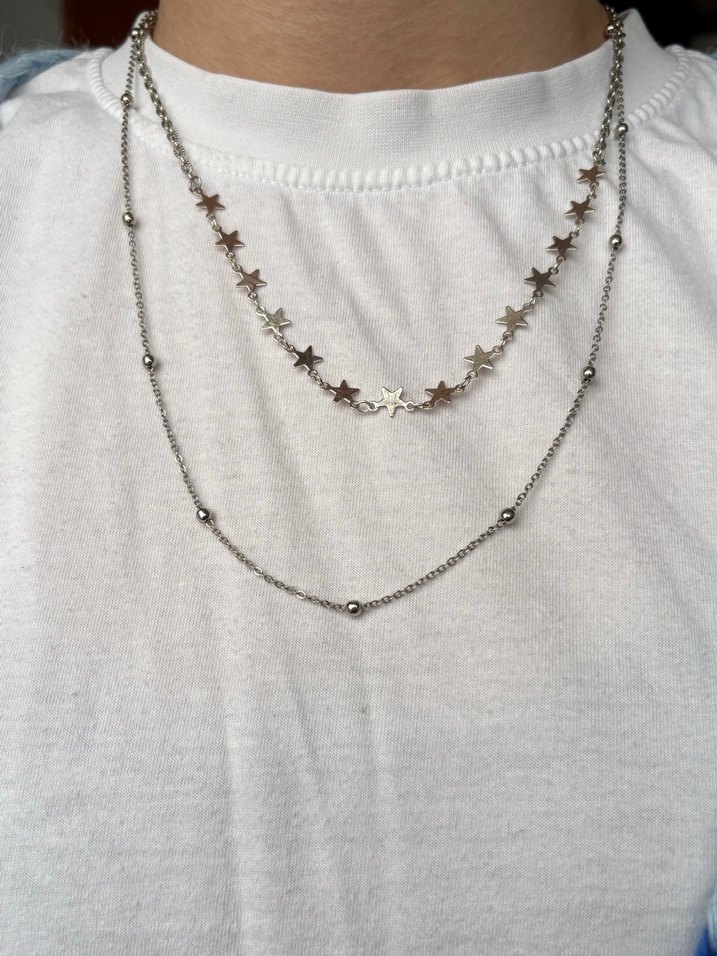 Gri renkte, yıldız şeklinde detaylara sahip iki katmanlı ince zincir kolye. Minimalist bohem tarzda, günlük kullanıma uygun normal uzunlukta. ✨