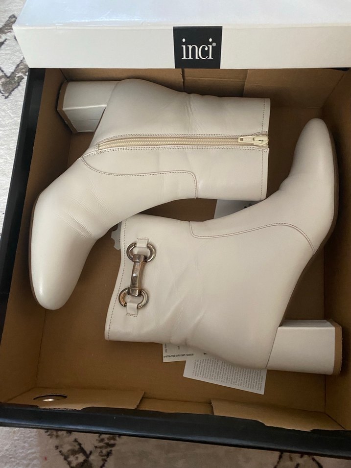 Sadece iki kere giyildi . Bej renkte, Gerçek deri malzemeden yapılmış, blok topuklu ve tokalı kadın botu. Düz ve desensiz tasarımıyla günlük kullanıma uygundur. İnci markası.