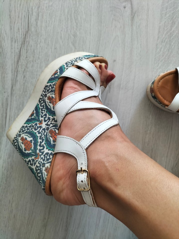 Beyaz desenli dolgu topuklu sandalet, tokalı kayış ve kauçuk taban ile bohem tarzını yansıtıyor. 37 numara fakat 36 numara giyen biri alabilir. sık kullanıma bağlı deformeler mevcuttur. görsellerdeki gibidir.