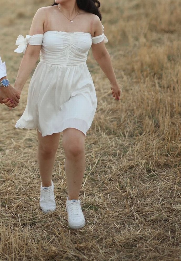 Dış çekim ve düğün after’ında kullanıldı çok güzel inci gibi parlayan ipeksi bir kumaşa sahip kolları düşük bağlı şekilde kullanıldı omuz üstü olarakta kullanılabilir kendinden kaplı straplez yaka astarlı sorunsuz mini elbise