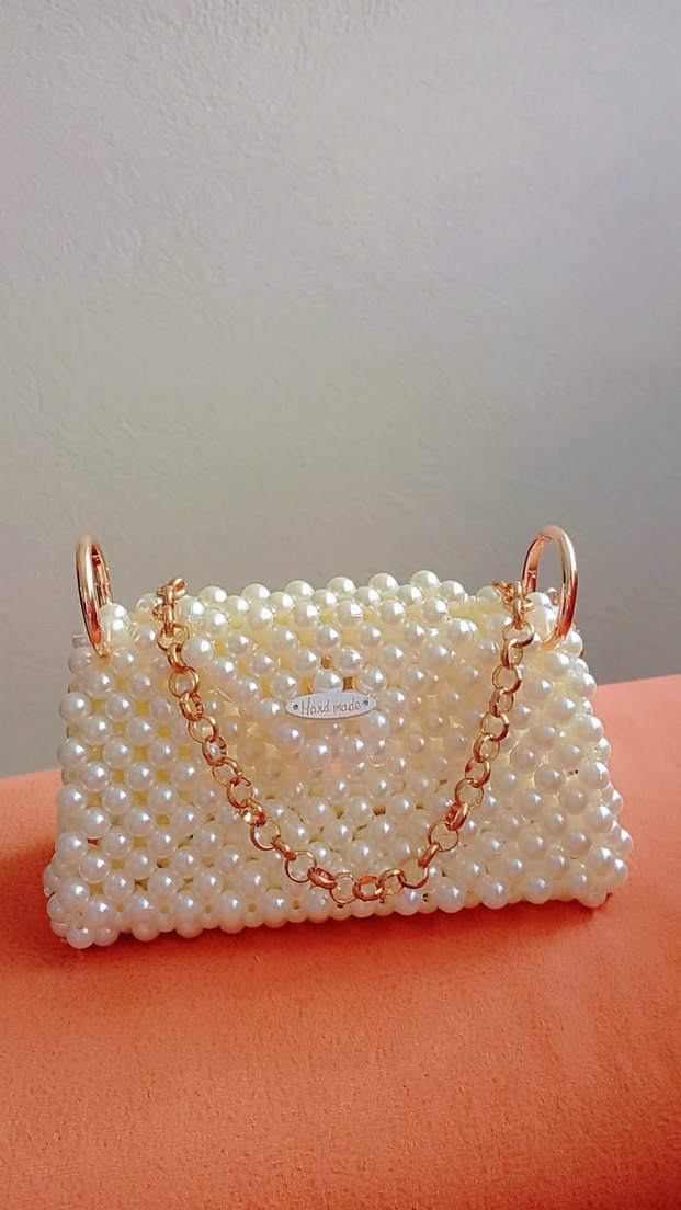 Boncuk işlemeli, parlak inci görünümlü beyaz kadın çantası, altın renk zincir saplıdır. Düğünler için bohem tarzda uygundur. ✨