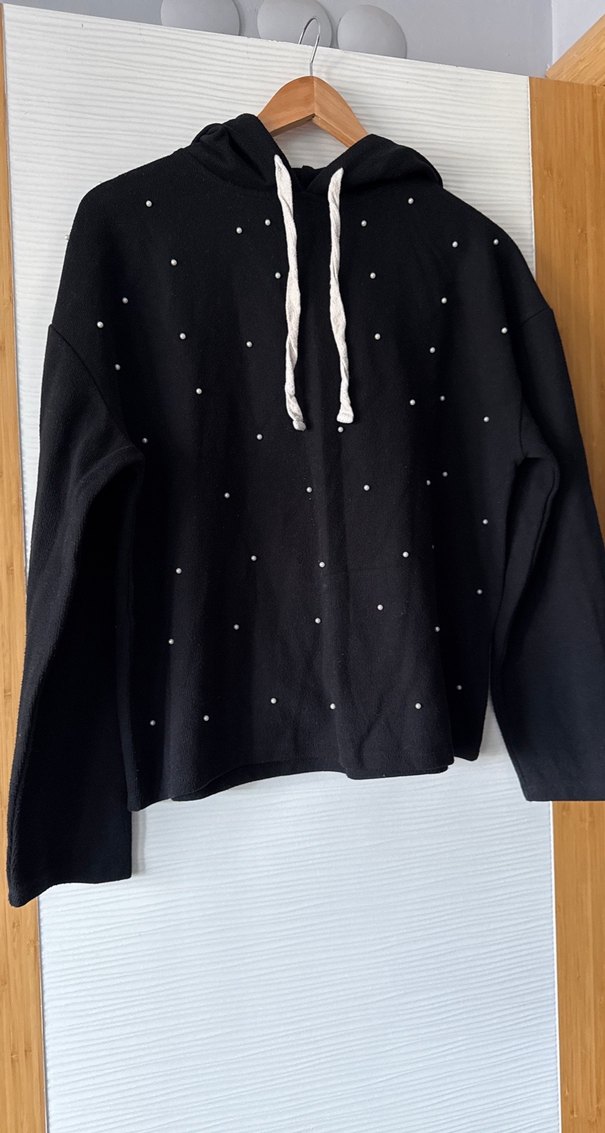 İnci Boncuk İşlemeli Siyah Kapüşonlu Triko Sweatshirt