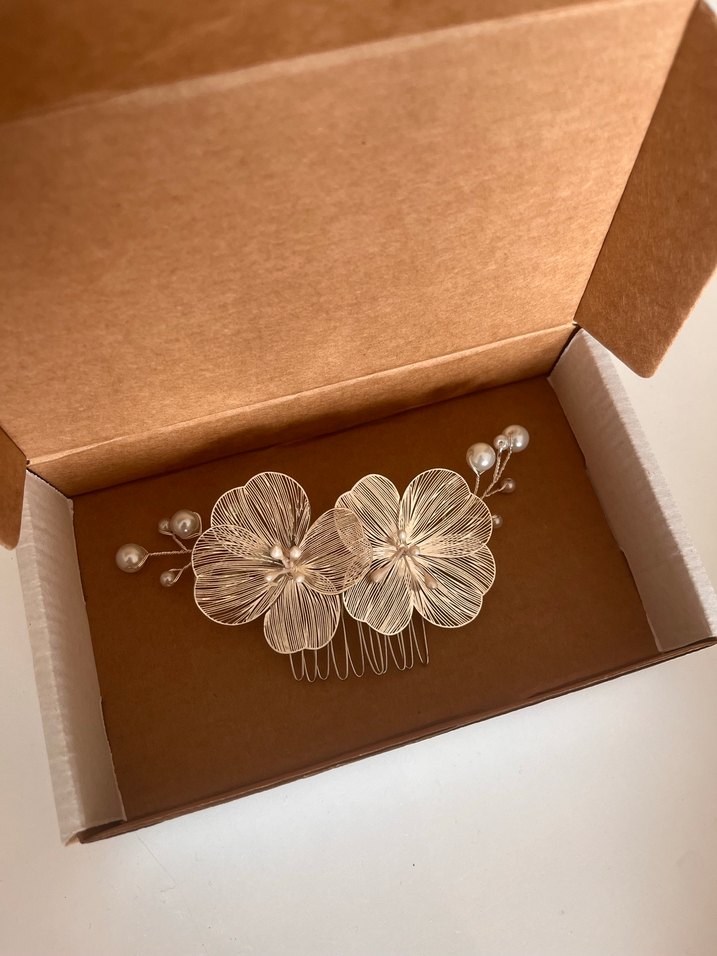 Bej renkte, kağıt malzemeden yapılmış, boncuk detaylı vintage tarzda zarif çiçek desenli saç tokası.