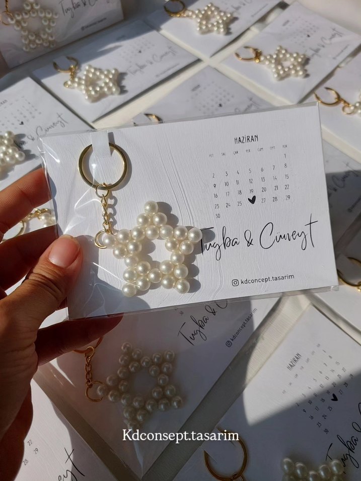 Yıldız şeklinde beyaz boncuklu, hafif ve bohem tarzda anahtarlık. Küçük takvim kartı ile birlikte gelir.