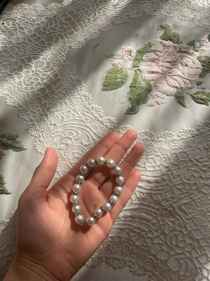 İnci görünümlü boncuklardan oluşan beyaz bohem tarzda, desensiz ve pastel renkli bileklik. Düğünler için uygun.
