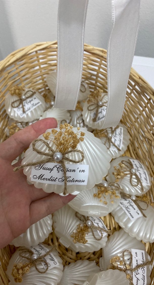 İnci boncuklu ve kurutulmuş çiçek detaylı, açık beyaz deniz kabuğu Mevlüt hediyesi. 20 adet