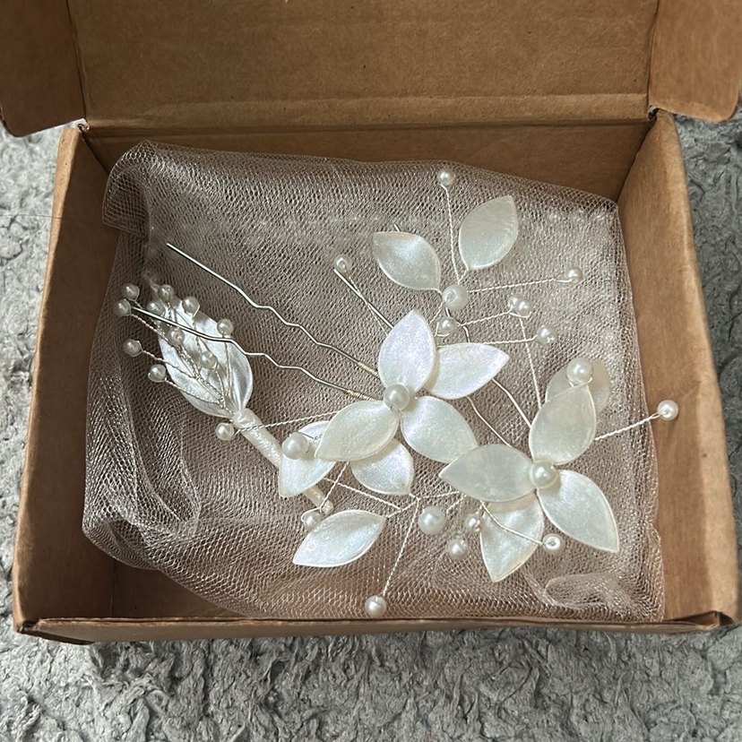 İnci boncuklu, beyaz bu saç aksesuarı, bohem ve vintage tarzıyla modayı takip edenler için ideal. Sadece nişanımda kullandım, ayrıca erkek yaka aksesuarı ve kutu içerisinde inciler mevcut belki işinize yarar ben nişan tepsimde kullanmıştım.