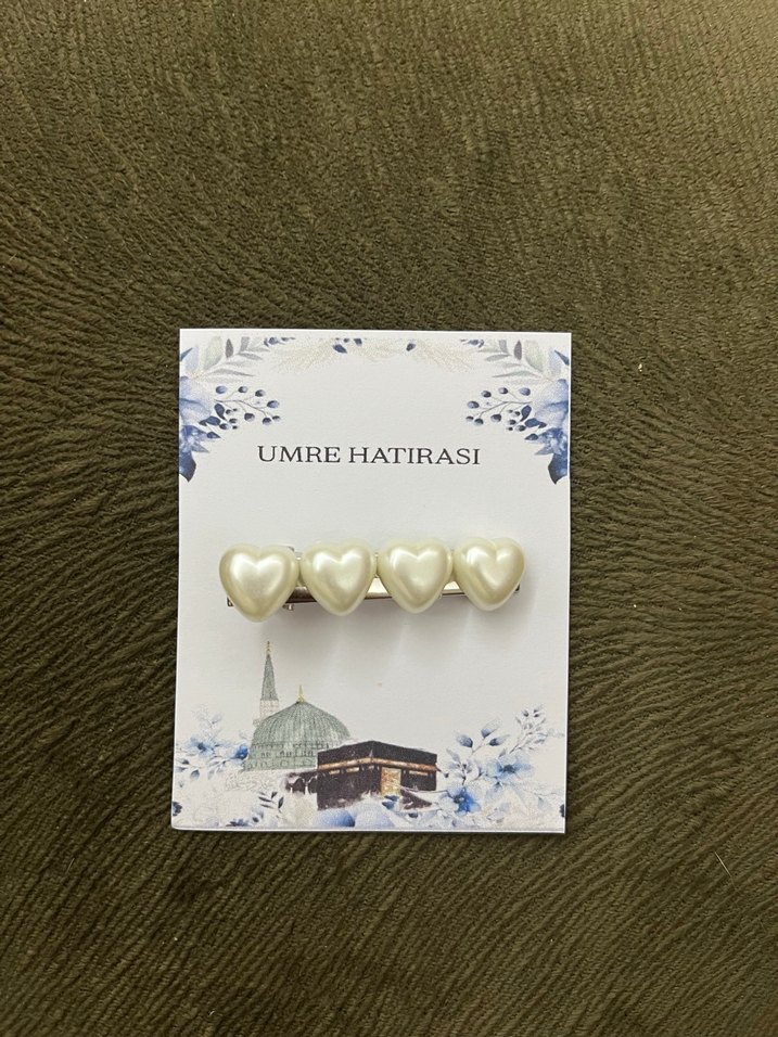 Seramikten yapılmış, üzerinde dört boncuklu beyaz kalp bulunan ve 'UMRE HATIRASI' yazılı saç tokası. ❤️