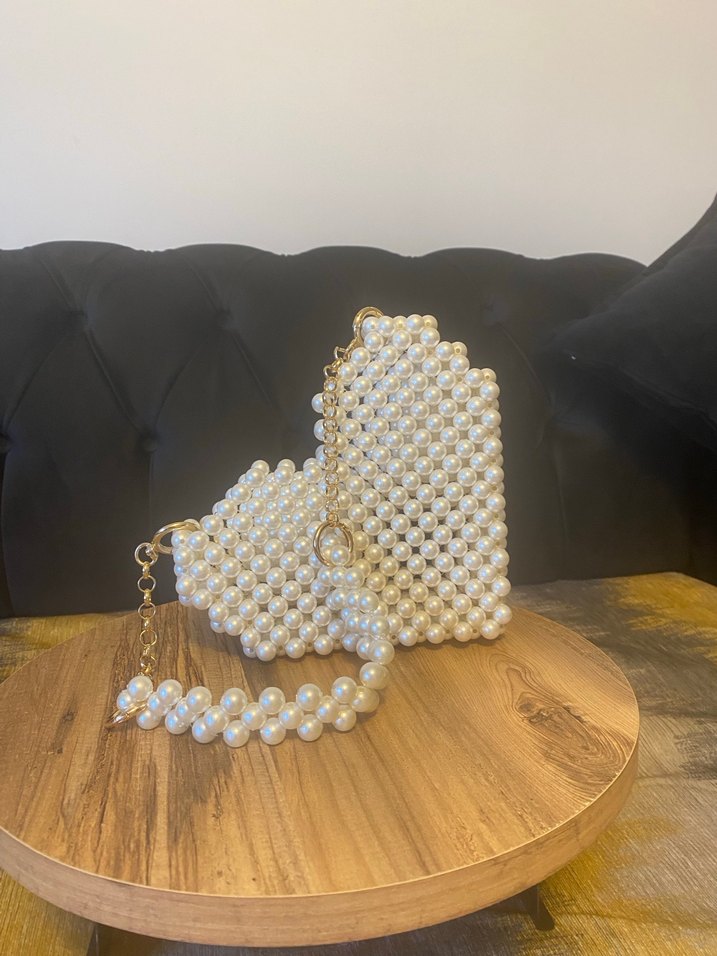 İnci boncuklarla süslenmiş krem renk örgü kadın çanta, nakış detaylıdır. Bohem tarzda, düğünler için uygundur.
