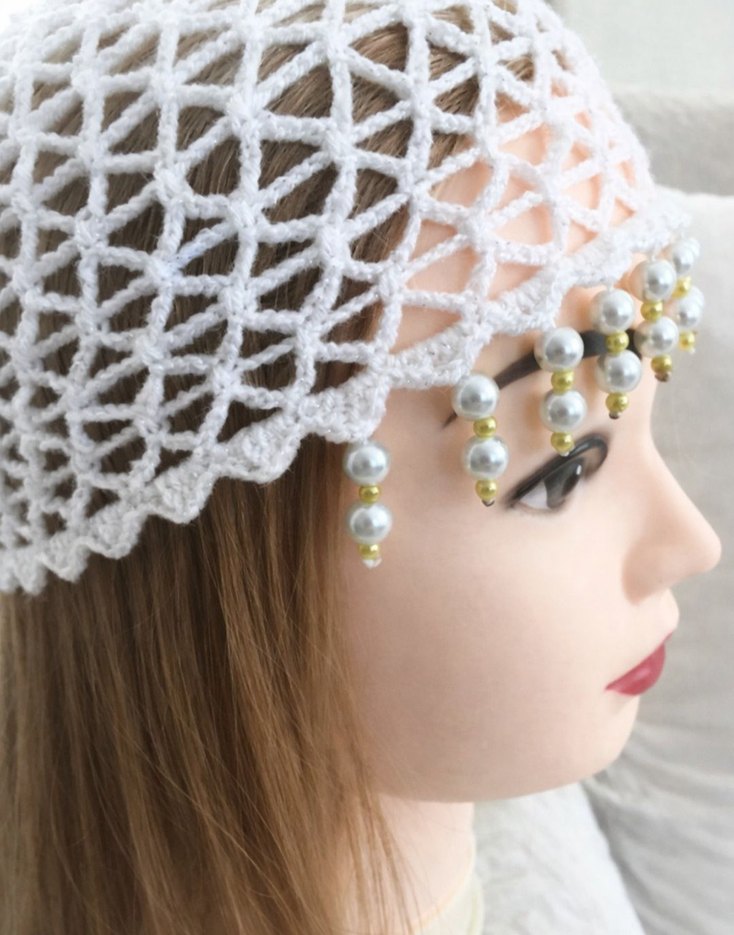 Beyaz örgüden yapılmış, inci boncuk detaylı kadın şapkası. Kenarlarında sarkan boncuklar ve bohem tarzı öne çıkar.