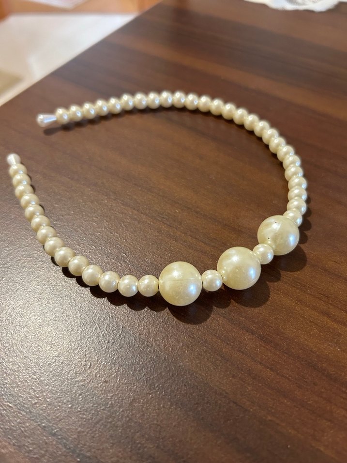 İnci boncuklarla süslenmiş beyaz saç aksesuarı, ipeksi dokusu ve modern klasik tasarımıyla klasik zarafeti yansıtıyor.