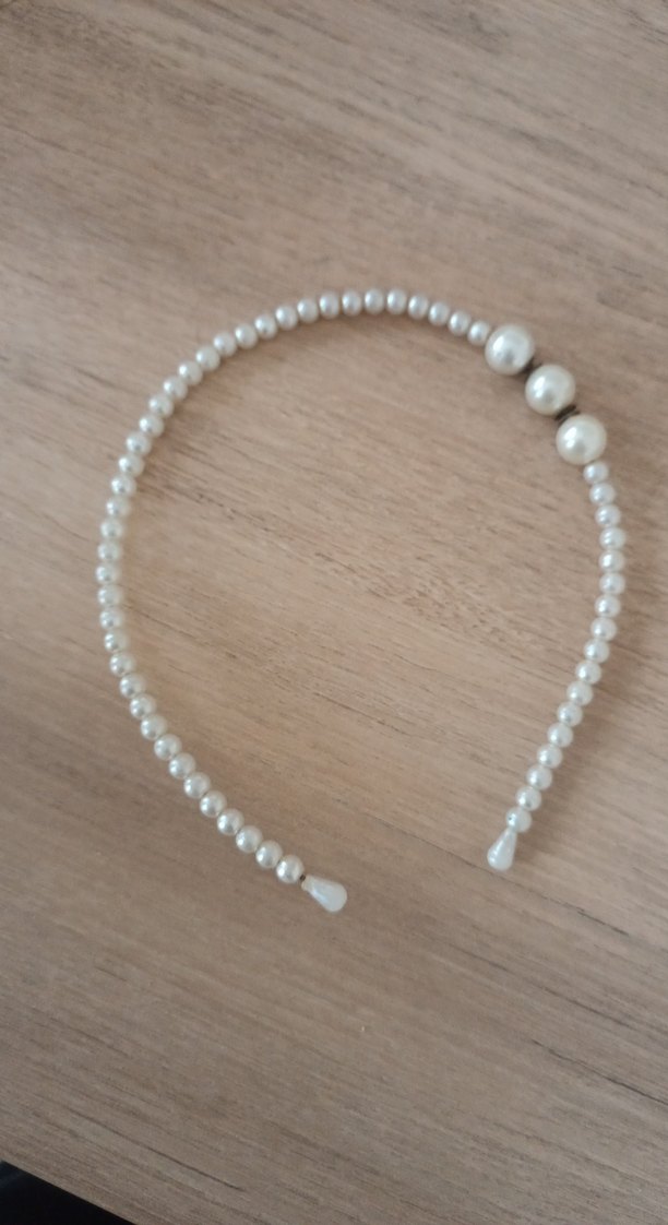 İnci boncuklarla süslenmiş beyaz saç aksesuarı, hafif parlak ve minimal bohem tarzda, nostaljik bir hava katıyor. ✨5 tl