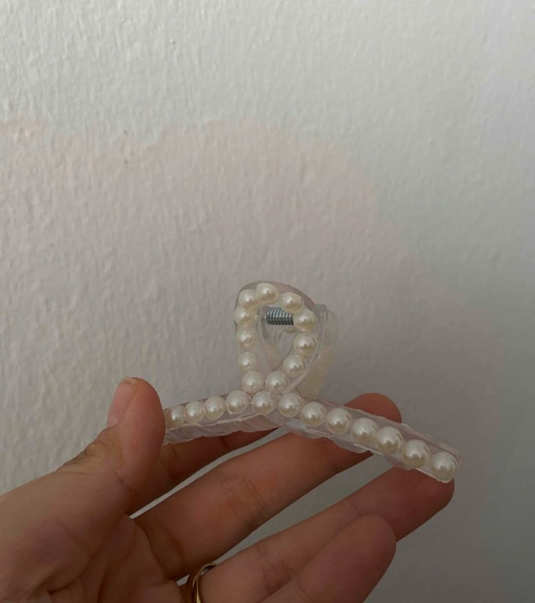 İnci boncuklarla süslenmiş beyaz plastik saç tokası, bohem tarzında. Hafif, Paris esintili görünüm için ideal.