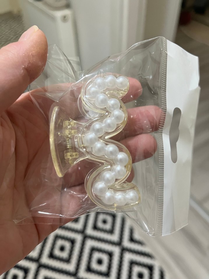 Dalgalı tasarıma sahip, inci boncuklarla süslenmiş beyaz plastik saç tokası, modern bir görünüm sağlar.