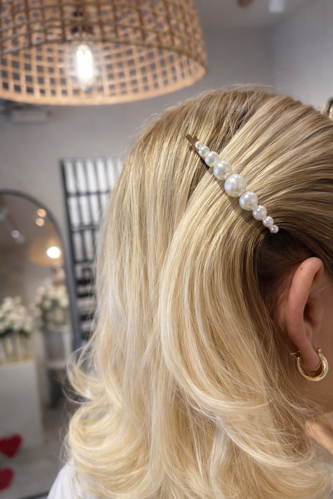 İnci boncuklarla süslenmiş beyaz saç tokası, ipeksi dokusu ve çağdaş tasarımıyla modaya uygun bir görünüm sunar. ✨ 2 adet fiyatıdır