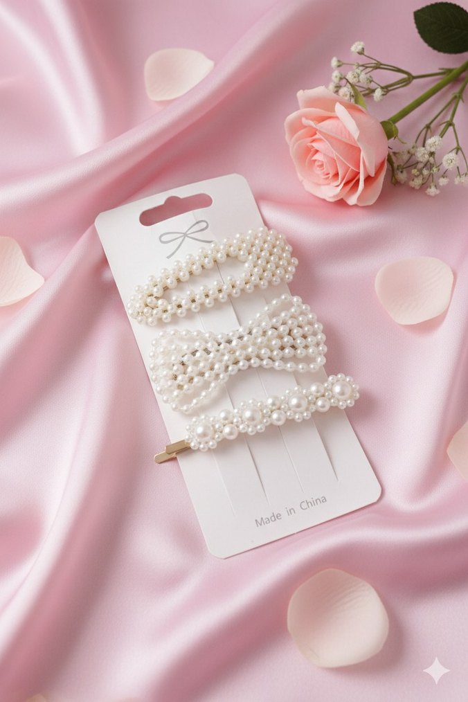Plastik malzemeden yapılmış, boncuklu beyaz üçlü saç tokası seti. Pastel Paris tarzına uygun bohem görünüm sunar. "Made in China" etiketi bulunur.