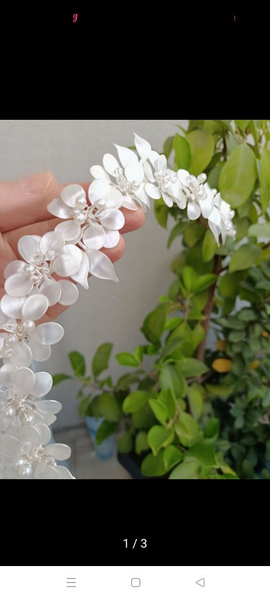 Beyaz saten yapraklar ve inci boncuklarla süslenmiş, minimalist ve bohem tarzda şık bir saç aksesuarı.