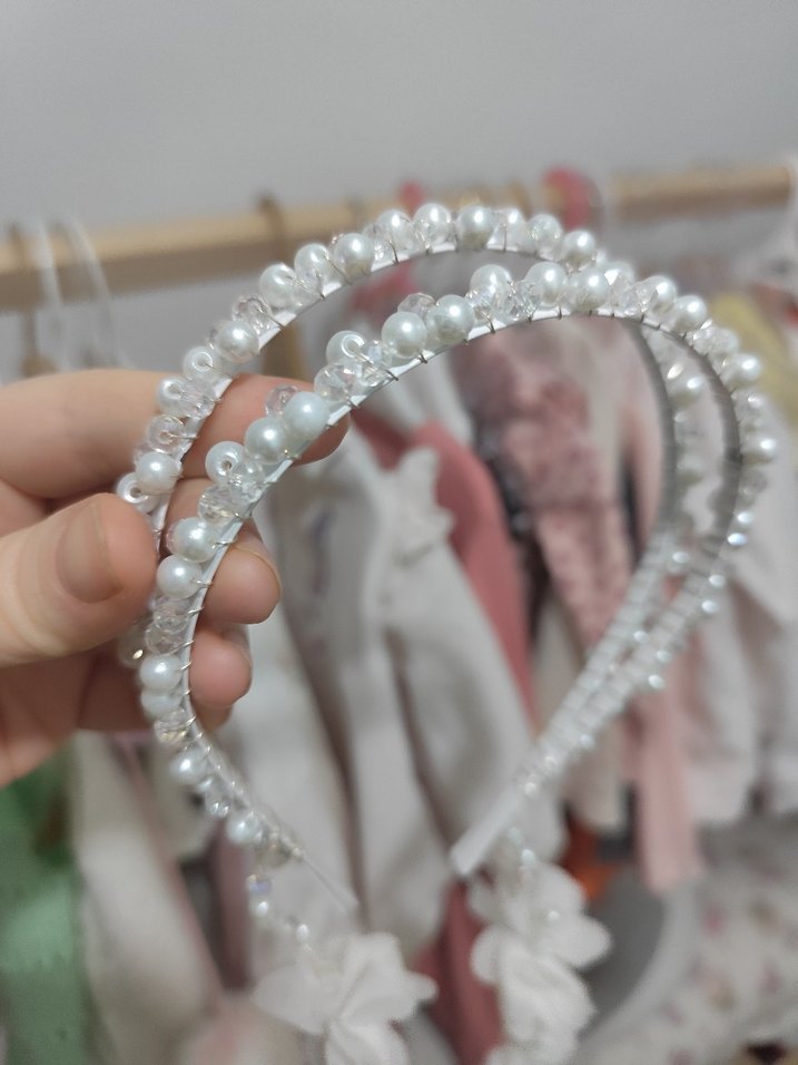 Plastik tabanlı, inci boncuklarla süslenmiş beyaz taç, klasik ve şık bir görünüm sunar. Saçlara zarif bir dokunuş katar.