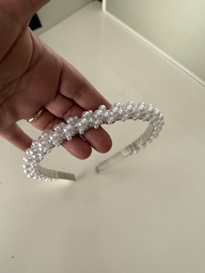 Beyaz incilerle boncuklarla süslenmiş, klasik şıklıkta ve modern tarzda ışıltılı bir taç. Saç aksesuarınıza zarif bir dokunuş katıyor.