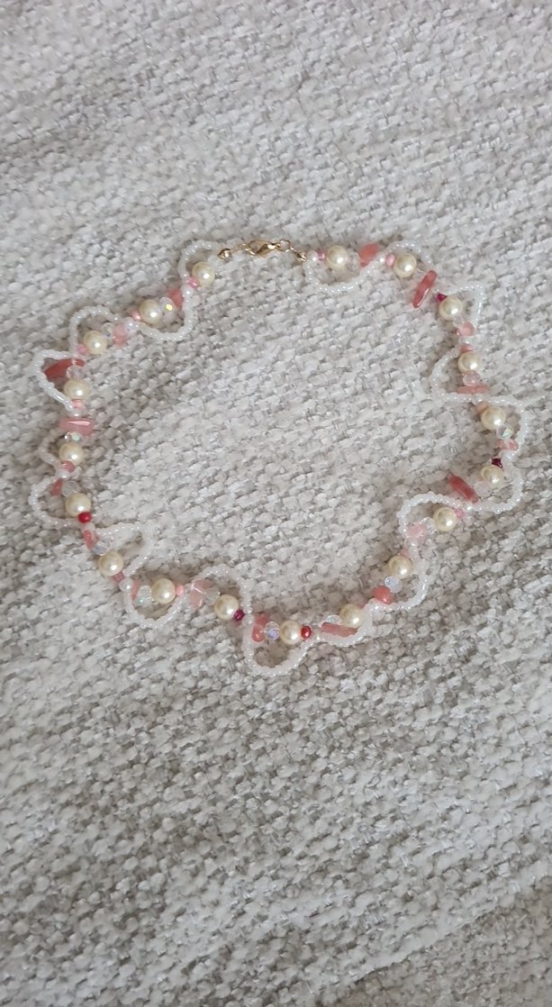 Bu bohem tarzı kolye, beyaz boncuklar ve nakışlı pastel detaylar içerir. Midi uzunlukta olup düğün ve günlük kullanım için uygundur.
