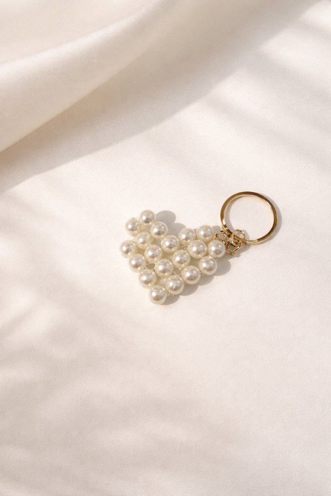 Kadın anahtarlık, inci görünümlü boncuklardan oluşan geometrik desene sahip, altın renkli halka ile tamamlanmıştır. Minimalist ve bohem tarzda klasik şıklık sunar. Nikah, kına, Mevlüt gibi özel günlerde toplu alımlarda indirim yapılır.
