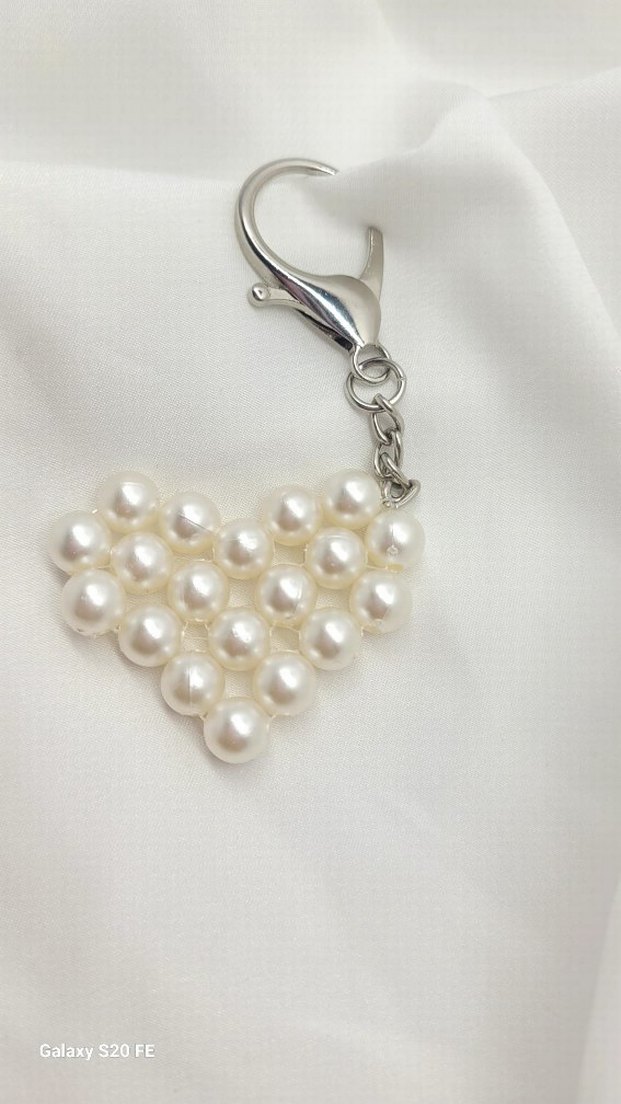 Beyaz inci görünümlü boncuklardan oluşan kalp şeklinde modern kadın anahtarlık, gümüş renkli toka ile tamamlanmıştır.