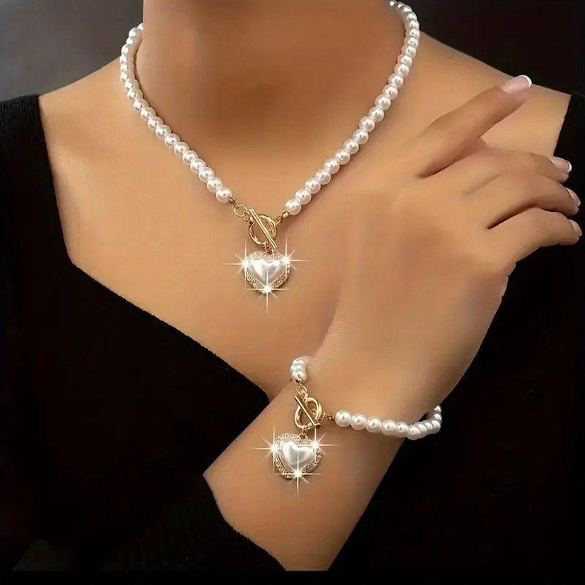 İnci Boncuklu Kalp Detaylı Kolye ve Bileklik Seti