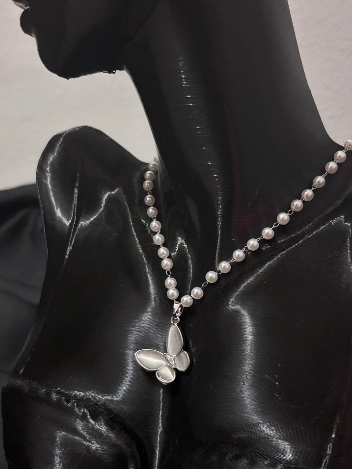 Midi uzunlukta, beyaz boncuklu inci ve işlemeli kelebek kolye.